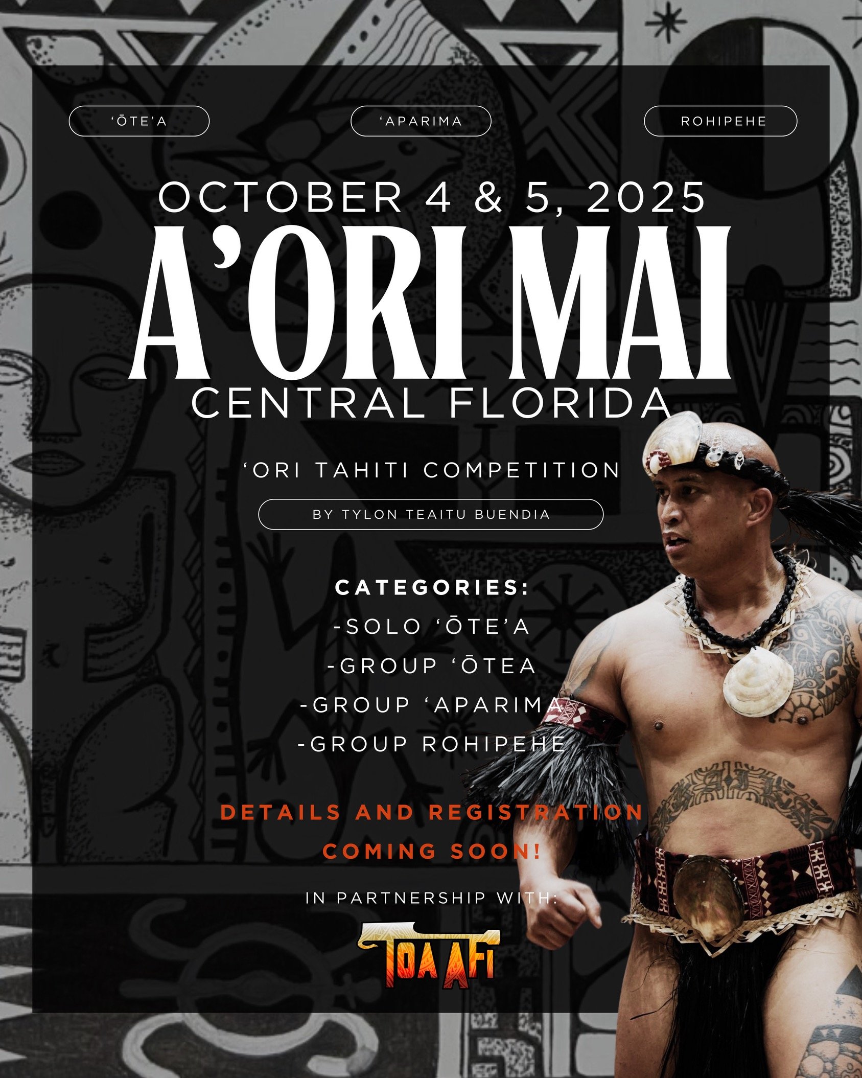 Toa Afi Orlando 501(c) presents the 3rd Annual East Coast Pacific Islander Festival happening OCTOBER 4TH & 5TH 2025. This two day event is a jam packed weekend full of Polynesian art, music, food and dance. Come experience the 1st Annaul A’ORI MAI Tahitian dance competition and 8th annual TOA AFI ORLANDO FIRE KNIFE COMPETITION!